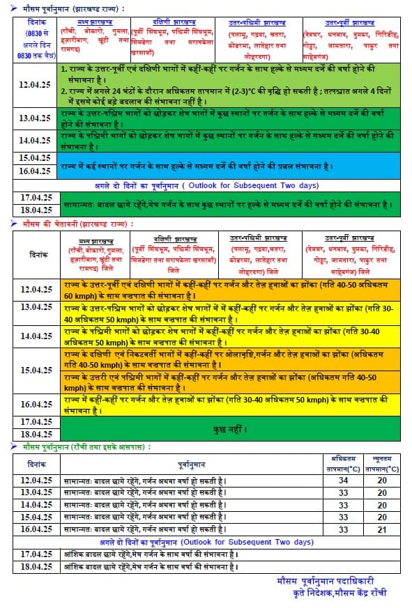 मौसम विभाग के पूर्वानुमान के अनुसार झारखंड में 18 अप्रैल तक मौसम कूल-कूल रहेगा. तेज हवाओं के साथ बारिश होगी. गरज के साथ वज्रपात की भी आशंका जतायी गयी है. मौसम विभाग ने इस दौरान मौसम को देखते हुए येलो और ऑरेंज अलर्ट जारी किया है. आम लोगों को आगाह किया गया है कि मौसम खराब हो तो सतर्क रहें. पेड़ के नीचे नहीं रुकें. बिजली के खंभों से दूर रहें.
