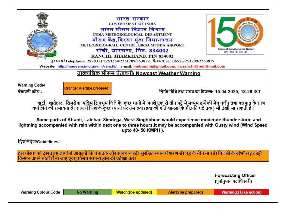 ये भी पढे़ं: झारखंड में बदलेगा मौसम, 50 किमी प्रति घंटे की रफ्तार से चलेंगी हवाएं, बारिश और वज्रपात का अलर्ट