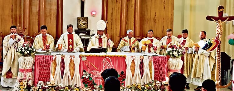 रांची. महाधर्माध्यक्ष विंसेंट आईंद ने संत मरिया गिरिजाघर में पवित्र परिवार के पर्व दिन संत पिता फ्रांसिस द्वारा घोषित जुबिली वर्ष 2025 आशा के तीर्थयात्री का उदघाटन किया. समारोह की धर्मविधि गिरजा परिसर में आरंभ हुई. इस जुबिली वर्ष के लिए एक विशेष क्रूस का निर्माण किया गया है, जिसकी बनावट सामान्य क्रूस से भिन्न है. यह क्रूस दिखने में झुका हुआ और नीचे का हिस्सा जहाज के लंगर के समान है. यह जीवन के हलचल में एक ठहराव प्रदान करने का प्रतीक है. चार रंग लाल, पीला, हरा, और नीला रंग के चार व्यक्ति एक के पीछे एक क्रूस पकड़े हुए हैं, जो संपूर्ण मानव जाति का प्रतिनिधित्व करता है. इस क्रूस को रांची कैथोलिक महाधर्मप्रांत में पल्ली के माध्यम से सभी गांवों और टोला में आराधना के लिए घुमाया जायेगा.