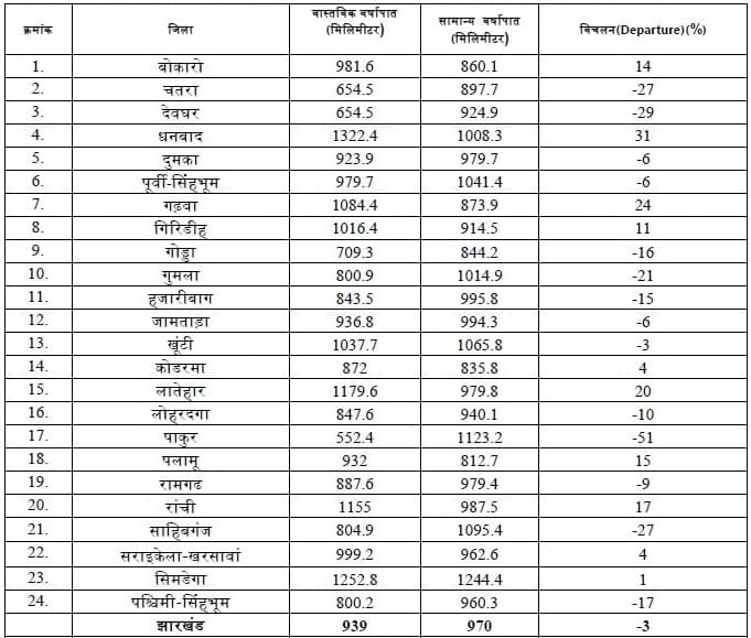 1 जून से 22 सितंबर तक झारखंड के किस जिले में कितनी वर्षा