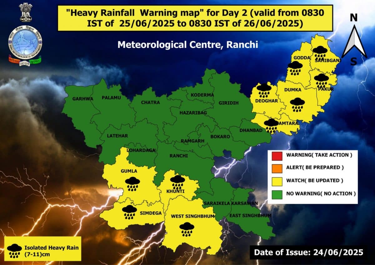 इतना ही नहीं, अरब सागर से एक ट्रफ दक्षिणी झारखंड और उससे सटे हिस्सों से गुजर रहा है. अभी यह ट्रफ समुद्र तल से 3.1 किलोमीटर ऊपर है. इसका असर झारखंड के मौसम पर पड़ेगा. कल यानी 25 जून 2025 (बुधवार) को झारखंड के दक्षिण-पश्चिमी और उत्तर-पूर्वी भागों में कहीं-कहीं भारी बारिश होगी. राज्य में कहीं-कहीं गर्जन, तेज हवाओं का झोंका (अधिकतम गति 30 से 40 किलोमीटर) के साथ वज्रपात की भी संभावना है.