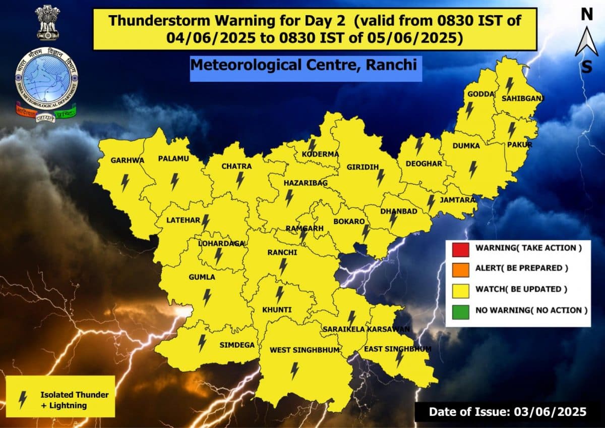 Kal Ka Mausam: भारत मौसम विज्ञान विभाग (आईएमडी) ने कल यानी 4 जून को झारखंड में कहीं-कहीं गरज के साथ वज्रपात की चेतावनी दी है. कहा है कि कुछ जगहों पर गरज के साथ हल्के दर्जे की वर्षा हो सकती है. मौसम केंद्र रांची ने बताया है कि अगले 3 दिन के दौरान अधिकतम तापमान में कोई बड़ा बदलाव नहीं होगा, लेकिन इसके बाद अगले 2 दिन में अधिकतम तापमान में 2 से 3 डिग्री सेंटीग्रेड की वृद्धि हो सकती है.