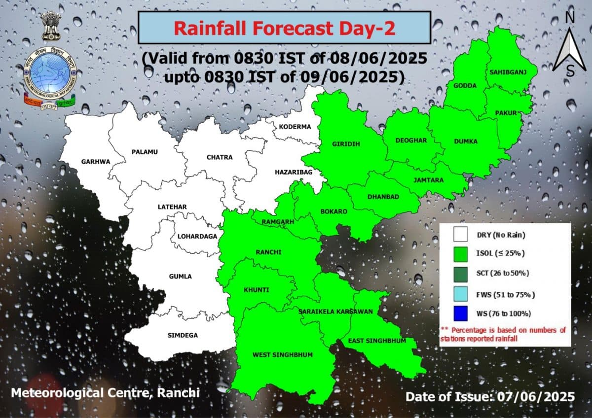 रांची के मौसम केंद्र के मौसम पूर्वानुमान विभाग ने हालांकि, कोई मौसम चेतावनी जारी नहीं की है. कहा है कि रांची में आंशिक बादल छाये रहेंगे. मेघ गर्जन के साथ वर्षा की संभावना है. अधिकतम तापमान 35 डिग्री और न्यूनतम तापमान 24 डिग्री सेंटीग्रेड रहने का अनुमान है.