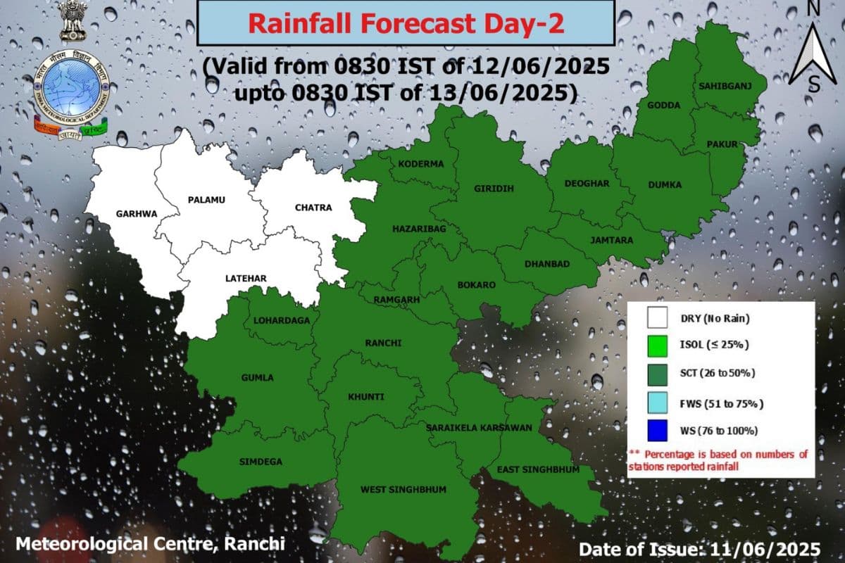मौसम विभाग के मुताबिक, मझगांव में 18.4 मिलीमीटर, चक्रधरपुर में 1.2 मिलीमीटर, जगन्नाथपुर में 0.5 मिलीमीटर, सिमडेगा के बानो में 0.5 मिलीमीटर वर्षा हुई है. मौसम वैज्ञानिक ने बताया कि राजधानी रांची के तापमान में कल यानी 12 जून को गिरावट दर्ज की जा सकती है. यहां का उच्चतम तापमान 33 डिग्री और न्यूनतम तापमान 23 डिग्री सेंटीग्रेड रह सकता है. गरज के साथ बारिश भी हो सकती है.