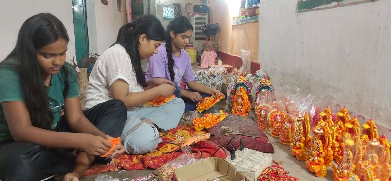 17 खलारी 07: खलारी के जेहलीटांड़ में लक्ष्मी गणेश की आकर्षक मूर्ति का अंतिम रूप देते कुम्हार परिवार.