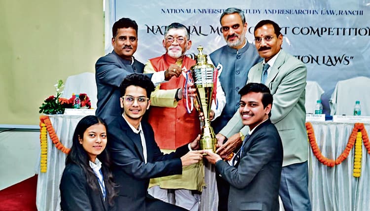 रांची. नेशनल यूनिवर्सिटी फॉर रिसर्च एंड स्टडी इन लाॅ (एनयूएसआरएल) रांची में रविवार को राष्ट्रीय मूट कोर्ट प्रतियोगिता का फाइनल राउंड हुआ. जिरह के पेशेवर तौर-तरीके पेश कर निरमा यूनिवर्सिटी अहमदाबाद की टीम विजेता चुनी गयी. वहीं, कम अंक के अंतर से दिल्ली यूनिवर्सिटी की टीम राष्ट्रीय मूट कोर्ट प्रतियोगिता की उपविजेता रही. प्रतियोगिता में निरमा यूनिवर्सिटी अहमदाबाद की टीम की भूमिका अग्रवाल को ””बेस्ट स्पीकर”” का पुरस्कार मिला. विजेता टीम में भूमिका के साथ आगम बाकलीवाल और सोम शर्मा भी शामिल थे. वहीं, दिल्ली यूनिवर्सिटी की टीम में पारू भारद्वाज, माधव शर्मा और नेहा शानबाग शामिल थे. विजेताओं को राज्यपाल संतोष कुमार गंगवार ने सम्मानित किया. प्रतियोगिता का आयोजन राष्ट्रीय उपभोक्ता संरक्षण कानून के अंतर्गत किया गया था.
