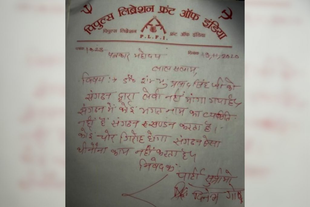 गुरुवार (19 नवंबर, 2020) को पीएलएफआइ के नाम से एक चिट्ठी सोशल मीडिया व्हाट्सएप्प के ग्रुप में वायरस हुआ. पीएलएफआइ सुप्रीमो दिनेश गोप के कथित हस्ताक्षर से जारी इस चिट्ठी में इंडियन मेडिकल एसोसिएशन (आइएमए) के सचिव डॉ शंभु प्रसाद से उसके संगठन की ओर से रंगदारी मांगे जाने का खंडन किया गया है. दिनेश गोप ने इसे घिनौना काम भी करार दिया है.