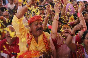 श्रीमदभागवत कथा के समापन में कथावाचक इंद्रेश जी महाराज ने खेली फूलों की होल
