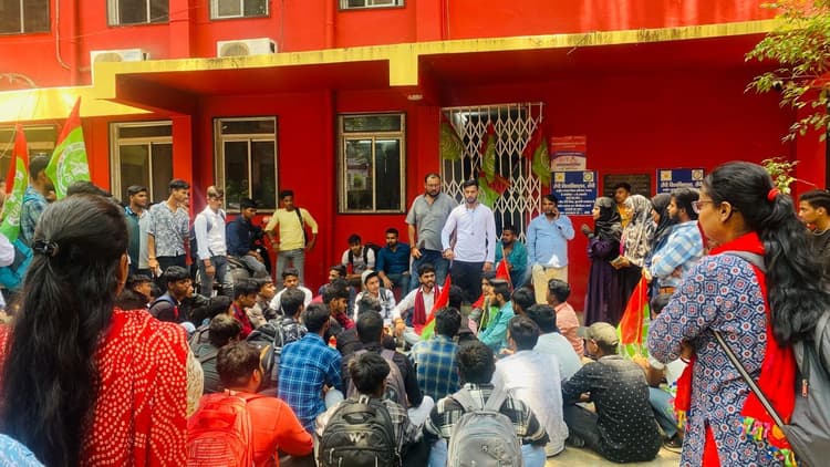 रांची (विशेष संवाददाता). रांची विवि अंतर्गत अंगीभूत कॉलेजों में इस सत्र से इंटरमीडिएट में नामांकन प्रक्रिया तथा पढ़ाई आरंभ कराने के मुद्दे पर शुक्रवार को मुख्यालय स्थित प्रशासनिक व रजिस्ट्रार कार्यालय भवन में आजसू ने तीन घंटे तक तालाबंदी कर दी. विवि अध्यक्ष अभिषेक शुक्ला के नेतृत्व में आजसू सदस्यों व विद्यार्थियों ने हाथों में बैनर तथा झंडा लेकर दिन के 11 बजे मुख्यालय पहुंचे और मुख्य द्वार पर तालाबंदी कर धरना पर बैठ गये. नामांकन प्रक्रिया शुरू नहीं होने से गुस्साये आजसू सदस्यों तथा विद्यार्थियों ने विवि प्रशासन के खिलाफ जम कर नारेबाजी भी की. श्री शुक्ला ने कहा कि राज्य के अन्य सरकारी विवि अंतर्गत अंगीभूत कॉलेजों में इंटरमीडिएट में नामांकन प्रक्रिया आरंभ कर दी गयी है. रांची विवि में संबद्ध व अल्पसंख्यक कॉलेजों में नामांकन शुरू कर दिया गया है. लेकिन रांची विवि अंतर्गत अंगीभूत कॉलेजों में अबतक प्रक्रिया शुरू नहीं हुई है. पढ़ाई बंद होने से सबसे ज्यादा यहां के गरीब एवं गरीबी रेखा से नीचे के विद्यार्थी प्रभावित होंगे. श्री शुक्ला ने कहा है कि मंगलवार तक कोई निर्णय नहीं होने पर आजसू विवि मुख्यालय में अनिश्चितकालीन तालाबंदी तथा धरना प्रदर्शन करेगा. इधर तालाबंदी को देखते हुए विवि के प्रॉक्टर डॉ मुकुंद चंद्र मेहता ने कुलपति से फोन पर वस्तुस्थिति की जानकारी देने बाद आंदोलनरत आजसू सदस्यों तथा विद्यार्थियों को बताया कि सोमवार तक निर्णय ले लेने का आश्वासन दिया. इसके बाद सभी सदस्य तथा विद्यार्थी अपराह्न दो बजे तालाबंदी समाप्त कर वापस लौट गये. इस अवसर पर विक्रम कुमार यादव, अजीत कुमार सिंह, चेतन प्रकाश, ओम वर्मा, मंजीत, प्रियांशु, राहुल कुमार, विशाल कुमार यादव, सुमित कुमार, साहिल कुमार, रूफी परवीन, साहिल, आदित्य, आकाश, गुंचा कमर, तम्मना प्रवीण आदि उपस्थित थे.