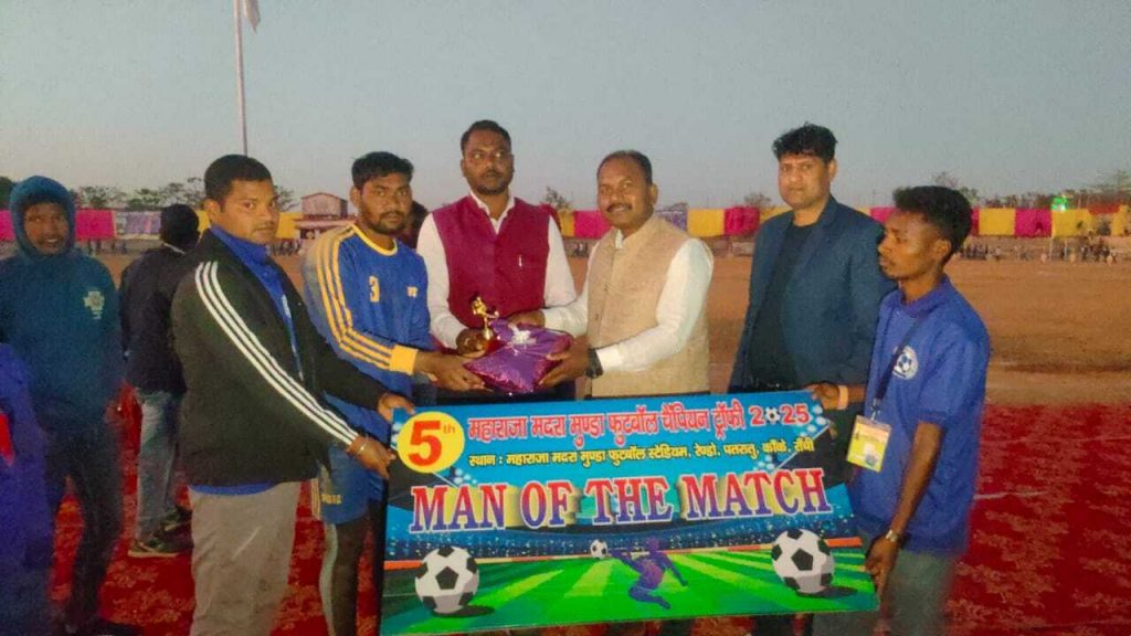 रांची. महाराजा मदरा मुंडा चैंपियंस ट्रॉफी फुटबॉल के पांचवें दिन क्वार्टर फाइनल मुकाबले हुए. पहले क्वार्टर फाइनल में बीएडीआरएफसी असम ने बांधगाड़ी एफसी को रोमांचक मुकाबले में 2-0 से हराया. मैच में शानदार प्रदर्शन करनेवाले लाल को पूर्व पंचायत समित मेसरा बबलू मुंडा और संदीप कुमार ने पुरस्कृत किया. दूसरे क्वार्टर फाइनल में बीपीएसएस दुबलिया ने टाइब्रेकर में इक्को एफसी चारीहुजीर को 4-2 से पराजित किया. निर्धारित समय तक दोनों टीमें एक-एक गोल से बराबरी पर रहीं. मैन ऑफ द मैच का पुरस्कार राज उरांव को पुलिस मेंस एसोसिएशन के उपाध्यक्ष देवचंद मुंडा व प्रदेश महामंत्री रमेश उरांव ने दिया.
