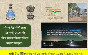 भारत मौसम विज्ञान विभाग (IMD) विश्व मौसम विज्ञान दिवस के अवसर पर समाज की सुरक्षा और भलाई के लिए मौसम, जलवायु और जल विज्ञान सेवाओं के योगदान को प्रदर्शित करने के लिए विभिन्न गतिविधियों का आयोजन करता है. पूर्वानुमान और संबंधित गतिविधियों के बारे में जनता को शिक्षित करने के उद्देश्य से झारखंड की राजधानी में स्थित मौसम केंद्र रांची 23 मार्च को विश्व मौसम विज्ञान दिवस मना रहा है.