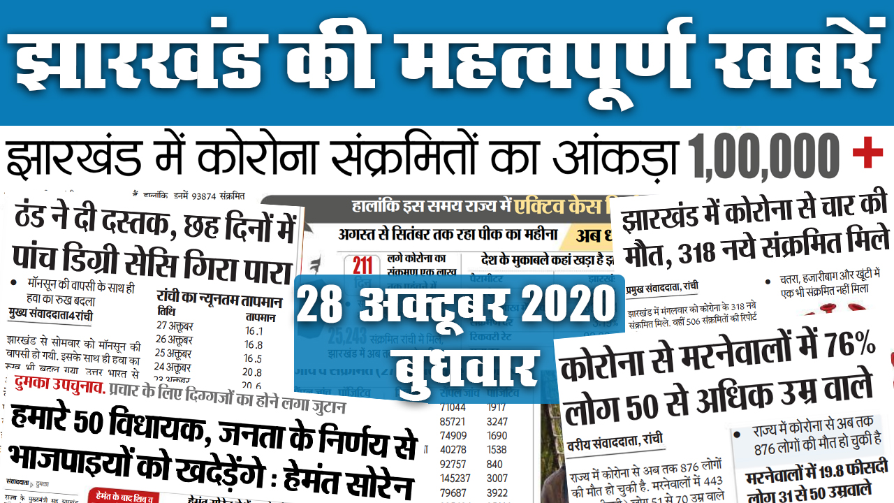 Jharkhand News, Ranchi, Deoghar, Jamshedpur, Dhanbad : झारखंड उपचुनाव के प्रचार में दिग्गजों का जुटान होने लगा है. हेमंत सोरेन ने कहा, हमारे 50 विधायक जनता के निर्णय से भाजपाइयों को खदेड़ेंगे. इसपर रघुवर ने जबावी हमला किया है. इधर, राज्य में ठंड ने भी दस्तक दे दी है. आइये जानते हैं राज्य में कोरोना समेत क्या है अन्य महत्वपूर्ण खबरें..