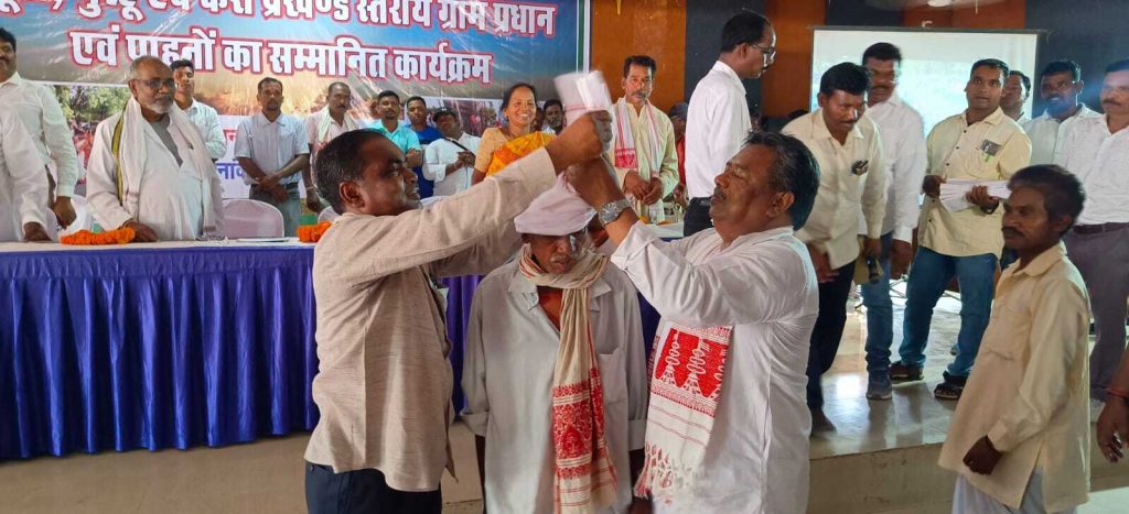 खूंटी. गांव के मुंडा, पहान, पुजार, ग्राम प्रधान को संगठित होने की जरूरत है. संगठित होकर ही धर्म, संस्कृति, जंगल, पहाड़ और नदी को बचाया जा सकता है. अब हम अपनी धर्म-संस्कृति की ओर जागरूक हो रहे हैं. उक्त बातें खूंटी विधायक नीलकंठ सिंह मुंडा सोमवार को नगर भवन में विधानसभा स्तरीय सरहुल मिलन संचालन समिति की ओर से आयोजित कर्रा, मुरहू और खूंटी के गांवों के ग्रामप्रधान, पहान और पुजार के सम्मान में आयोजित समारोह में बोल रहे थे. उन्होंने कहा कि ज्यादातर लोग सरना कोड की मांग कर रहे हैं. विधानसभा में जब सरना बिल आया था, तब उन्होंने अपनी बातों को रखा. बिल में आदिवासी/सरना में ओबलिक को हटाने का मांग रखी. इसके बाद उसे हटाया भी गया. उन्होंने कहा कि 1961 में आदिवासियों के लिए अलग कोड को हटा दिया गया. विधायक ने कहा कि उनका प्रयास है कि सभी लोगों का विकास करें. उसी प्रकार सरना समाज का भी विकास करना मेरा दायित्व है. उन्होंने बताया कि पिछले दिनों सरहुल मिलन समारोह में मुंडा, पहान, पुजार, ग्राम प्रधान को सम्मानित नहीं किया जा सका था. इस कारण आज उन्हें सम्मानित किया गया. इससे पहले विधायक ने मुरहू, कर्रा और खूंटी प्रखंड के ग्राम प्रधान, मुंडा, पहान-पुजार को पगड़ी पहनाकर स्वागत किया. इस अवसर पर गया मुंडा के वंशज रमय मुंडा को भी सम्मानित किया. समारोह को पूर्व नगर पंचायत अध्यक्ष अर्जुन पाहन, तेंबा उरांव, डहरू पाहन, हरि सिंह मुंडा, छुनकु मुंडा आदि ने संबोधित किया. स्वागत भाषण अनूप कुजूर ने किया. संचालन बिरसा धान और विनोद नाग ने किया. मौके पर विधायक प्रतिनिधि काशीनाथ महतो, रूपेश जायसवाल, राजेश महतो, सुरेश जायसवाल आदि उपस्थित थे.