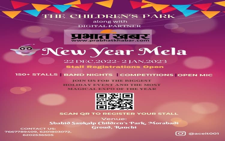 Ranchi News Year Mela: रांची के मोरहाबादी स्थित शहीद संकल्प चिल्ड्रेन पार्क में ACE ग्रुप की ओर से नये साल के स्वागत के लिए न्यू ईयर मेले का आयोजन किया जा रहा है. इसमें कई तरह के स्टॉल लगाये जा रहे हैं. वहीं 12 दिनों के इस मेले में कई तरह की प्रतियोगिताएं भी होंगी. स्टॉल्स लगाने के लिए रजिस्ट्रेशन चालू है. वहीं प्रतियोगिताओं में हिस्सा लेने के लिए भी रजिस्ट्रेशन कराना होगा. इसके लिए भी रजिस्ट्रेशन चालू है. यह सभी के लिए निःशुल्क है. बताते चलें कि इस न्यू ईयर मेले का मीडिया पार्टनर प्रभात खबर डीजिटल है.