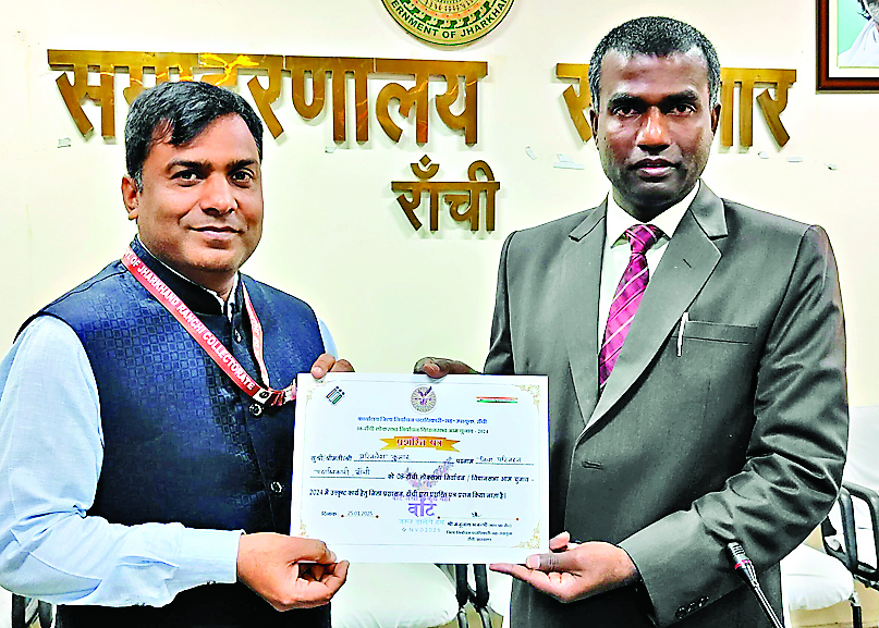 रांची. उपायुक्त मंजूनाथ भजंत्री ने समाहरणालय के ब्लॉक-ए सभागार में राष्ट्रीय मतदाता दिवस पर वरीय पदाधिकारियों और कर्मचारियों के साथ मतदाता प्रतिज्ञा ली. इस दौरान लोकसभा चुनाव 2024 एवं विधानसभा सभा चुनाव 2024 में बेहतरीन कार्य करने वाले अधिकारियों और कर्मचारियों को जिला प्रशासन द्वारा प्रशस्ति पत्र प्रदान किया गया. उपायुक्त ने कहा कि आपका मतदान सिर्फ मतदान नहीं, यह राष्ट्र और राज्य निर्माण की अहम जिम्मेदारी है. मतदान जरूर करें और लोगों को भी जागरूक करें..