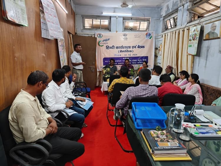 रांची. महत्वपूर्ण तिथियों पर कार्यालयों में हिंदी में परिचर्चा का आयोजन करना चाहिए. जिससे कर्मियों को भाषाई शुद्धता के साथ-साथ हिंदी में कार्य करने की प्रेरणा भी मिलेगी. यह बात सूचना एवं प्रसारण मंत्रालय के महानिदेशक अखिल कुमार मिश्रा ने कही. वह शुक्रवार को आयोजित त्रैमासिक हिंदी बैठक और कार्यशाला में बोल रहे थे. सूचना एवं प्रसारण मंत्रालय के पत्र सूचना कार्यालय एवं केंद्रीय संचार ब्यूरो, रांची द्वारा आयोजित बैठक हिनू स्थित सीबीसी रांची के कार्यालय कक्ष में हुई. अध्यक्षता करते हुए महानिदेशक अखिल कुमार मिश्रा ने आगे कहा कि बैठक से इसकी भी जानकारी मिलेगी कि कैसे हिंदी में शुद्धता के साथ अधिक काम हो और सरल हिंदी का कार्यालय में प्रयोग किया जा सके.