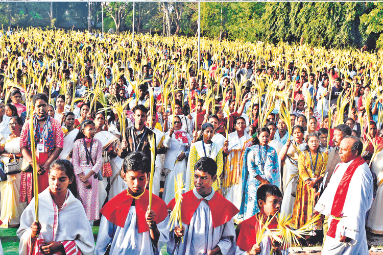 Palm Sunday 2024: रांची: यीशु मसीह के यरूशलेम में प्रवेश की स्मृति में मसीही विश्वासी आज पाम संडे (खजूर रविवार) की आराधना में शामिल हुए. आराधना में शामिल लोग खजूर की डालियों के साथ शामिल हुए और यीशु मसीह की जयघोष के साथ उनका स्वागत किया. इस अवसर पर रांची के लोयला मैदान में खजूर की डालियों की आशीष की गयी और फिर संत मरिया महागिरजाघर तक शोभायात्रा निकाली गयी. महागिरजाघर के प्रांगण में आर्चबिशप विसेंट आईंद ने विश्वासियों को खजूर रविवार के महत्व पर प्रकाश डाला.