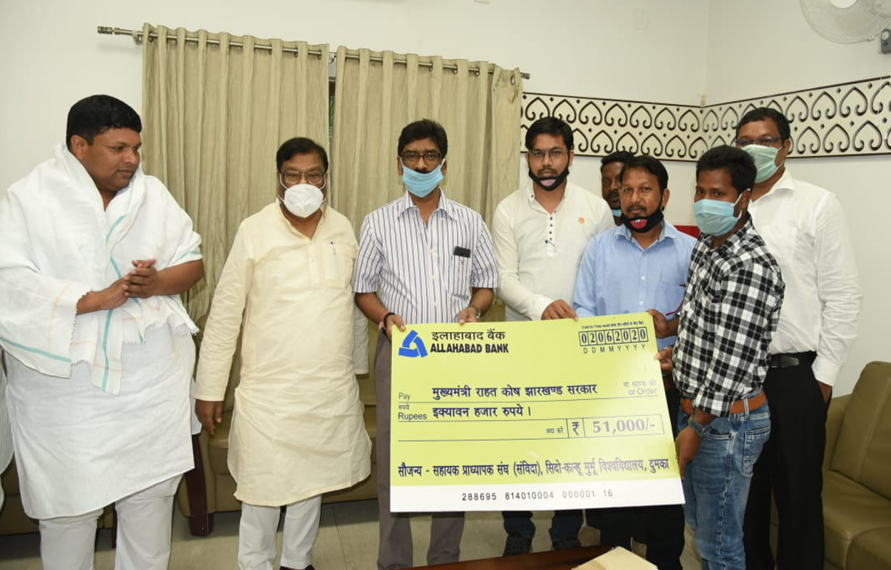 रांची : कोरोना संक्रमण (Corona infection) की रोकथाम के लिए मुख्यमंत्री राहत कोष में हर दिन लोगों का सहयोग बढ़ रहा है. सिदो-कान्हू मुर्मू विश्वविद्यालय, दुमका के अनुबंध सहायक प्राध्यापक संघ की ओर से 51 हजार रुपये का चेक मुख्यमंत्री को सौंपा गया. वहीं, इंश्योरेंस एम्लाॅई एसोसिएशन, हजारीबाग डिवीजन के सदस्यों ने मुख्यमंत्री राहत कोष के लिए 9 लाख 58 हजार रुपये का चेक और 60 थर्मल स्कैनर सौंपा है.