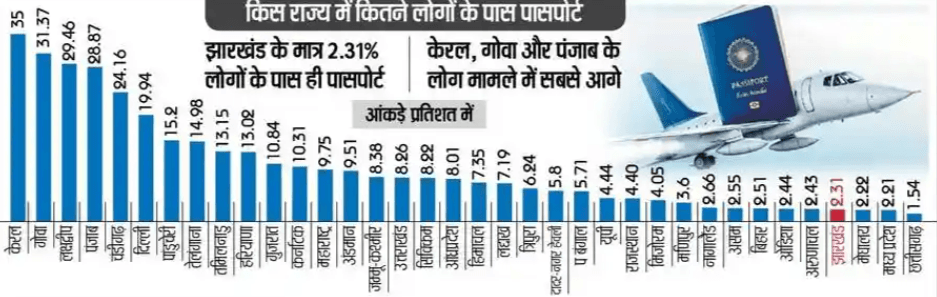 केंद्र सरकार के विदेश मंत्रालय ने आंकड़ा जारी है. इसके अनुसार झारखंड और बिहार दोनों ही राज्य विदेश यात्रा करने में अन्य राज्यों से काफी पीछे हैं. साथ ही राष्ट्रीय औसत से भी पीछे है. पासपोर्ट बनवाने वालों की कुल आबादी में झारखंड नीचे से चौथे स्थान पर है, तो वहीं बिहार नीचे से 7 वें स्थान पर है. झारखंड से नीचे तीन और राज्य हैं, जिसमें मेघालय, मध्य प्रदेश और छत्तीसगढ़ शामिल हैं.