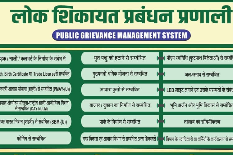 नगर निकायों के अंतर्गत रहने वाले नागरिक सड़क, नाली निर्माण एवं साफ-सफाई, जलापूर्ति, फॉगिंग, प्रधानमंत्री आवास योजना (शहरी), राष्ट्रीय शहरी आजीविका मिशन, मुख्यमंत्री श्रमिक योजना, फुटपाथ विक्रेताओं से संबंधित, होल्डिंग, अवैध निर्माण व नक्शा, अतिक्रमण, जन्म-मृत्यु प्रमाण पत्र, स्ट्रीट लाइट लगाने एवं उसकी मरम्मत आदि से संबंधित समस्याएं एवं सुझाव दर्ज करा सकते हैं.