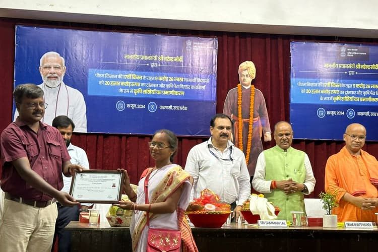 रांची: पीएम किसान की 17वीं किस्त के तहत देश के 9 करोड़ 26 लाख किसानों को 20 हजार करोड़ रुपए का वितरण एवं कृषि सखियों का प्रमाणीकरण किया गया. रांची के कृषि विज्ञान केंद्र (रामकृष्ण आश्रम सभागार) में इस अवसर पर कार्यक्रम का आयोजन किया गया. इस मौके पर प्रधानमंत्री किसान की सत्रहवीं किस्त ऑनलाइन हस्तांतरित की गयी. सभी ने पीएम मोदी के संबोधन को लाइव देखा. कांके विधायक समरी लाल ने कृषि सखियों को सर्टिफिकेट देते हुए कहा कि किसानों के कल्याण को लेकर केंद्र सरकार तत्पर है. पीएम मोदी ने अपने तीसरे कार्यकाल की शुरुआत ही किसान विकास योजनाओं की मंजूरी के साथ की है.