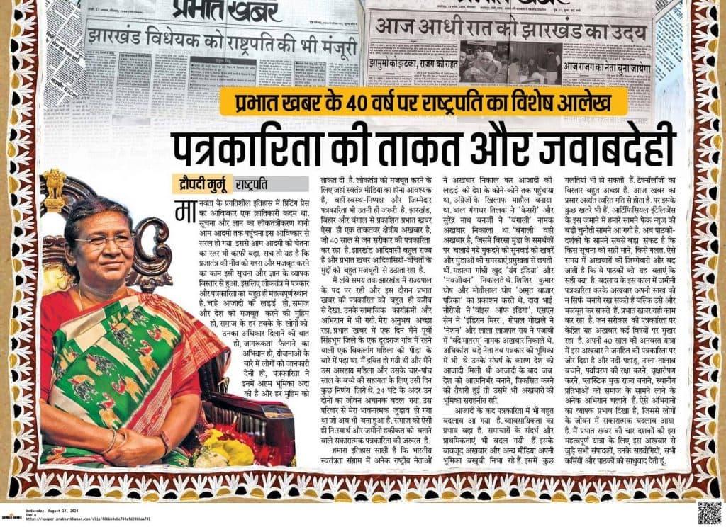 पत्रकारिता की ताकत और जवाबदेही, प्रभात खबर के 40 वर्ष पर पढ़ें राष्ट्रपति द्रौपदी मुर्मू का खास आलेख