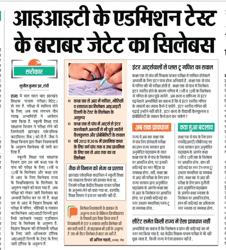सुनील कुमार झा, (रांची). राज्य में झारखंड शिक्षक पात्रता परीक्षा के पाठ्यक्रम में बदलाव होगा. वहीं, परीक्षा में सभी खंड में अलग-अलग क्वालिफाइंग मार्क्स लाने का प्रावधान भी समाप्त हो सकता है. परीक्षा का सिलेबस केंद्रीय शिक्षक पात्रता परीक्षा व एनसीटीइ की गाइडलाइन के अनुरूप होगा. परीक्षा को लेकर जारी सिलेबस का विरोध हो रहा है. प्रभात खबर ने अपने 25 अगस्त के अंक में झारखंड शिक्षक पात्रता परीक्षा के सिलेबस की विसंगति से संबंधित खबर प्रमुखता से प्रकाशित किया था. राज्य में अभ्यर्थी भी इसका विरोध कर रहे थे.