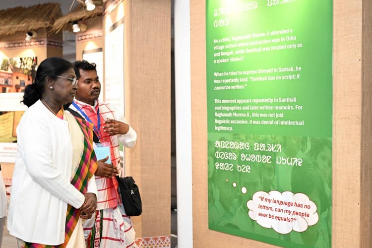 ओलचिकी लिपि का निर्माण पंडित रघुनाथ मुर्मू ने वर्ष 1925 में किया था. समय के साथ यह लिपि संथाल समाज की पहचान का मजबूत प्रतीक बन गयी. वर्ष 2003 में इसे संविधान की आठवीं अनुसूची में शामिल किया गया. इससे पूर्व राष्ट्रपति का स्वागत डॉ. आंबेडकर अंतर्राष्ट्रीय केंद्र के भीम हॉल में सैन्य बैंड द्वारा किया गया. बैंड ने पहले राष्ट्रगीत ‘वंदे मातरम’ और उसके बाद राष्ट्रगान ‘जन गण मन’ की प्रस्तुति दी. कार्यक्रम में लोक कलाकारों ने संथाली गीत गाये और संथाली डांसरों ने प्रकृति तथा भारत की सांस्कृतिक विविधता पर आधारित नृत्य प्रस्तुति दी.