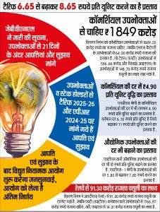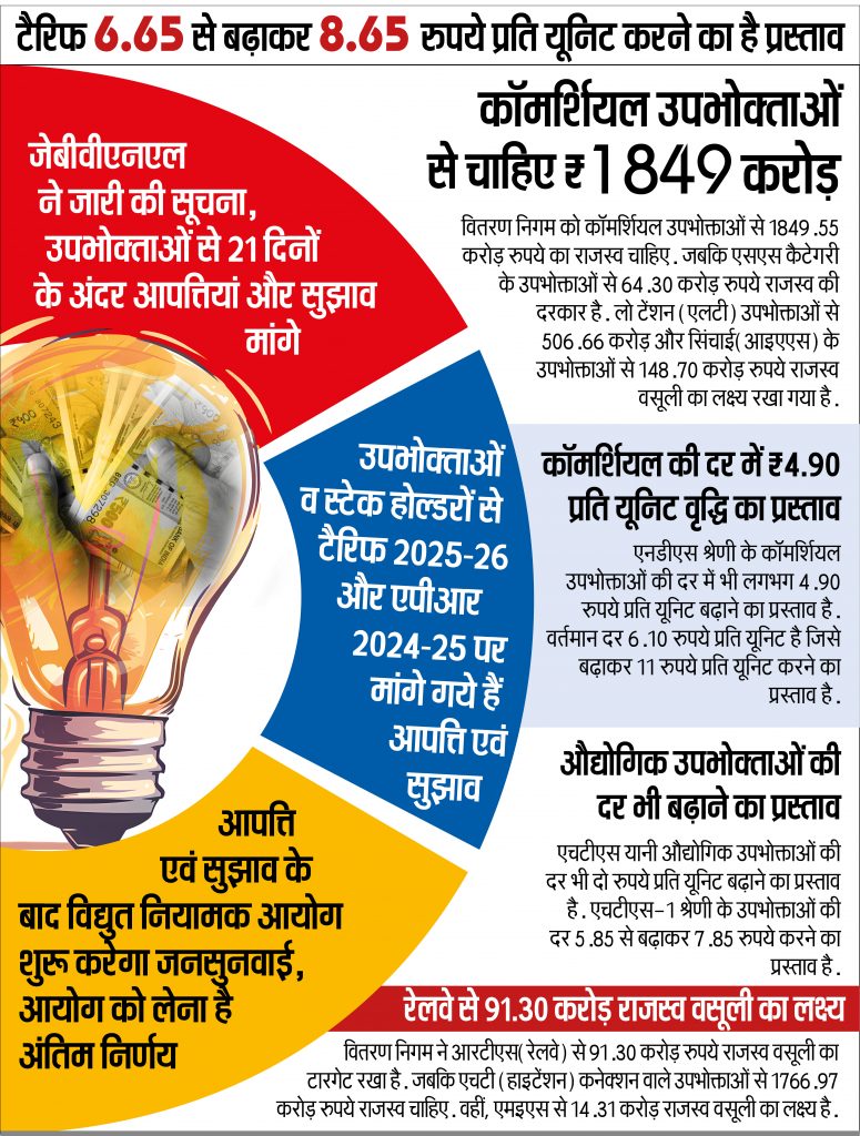 जेबीवीएनएल को सालाना राजस्व 10875.46 करोड़ रुपये चाहिए. आयोग में दायर एनअुल प्रोजेक्ट रिपोर्ट में जेबीवीएनएल ने घरेलू उपभोक्ताओं से 6433.46 करोड़ रुपये राजस्व वसूली का लक्ष्य रखा है. इसमें एनर्जी चार्ज के रूप में 5842.54 करोड़ और फिक्स चार्ज के रूप में 591.13 करोड़ शामिल है.डिस्क्लेमर: यह प्रभात खबर समाचार पत्र की ऑटोमेटेड न्यूज फीड है. इसे प्रभात खबर डॉट कॉम की टीम ने संपादित नहीं किया है