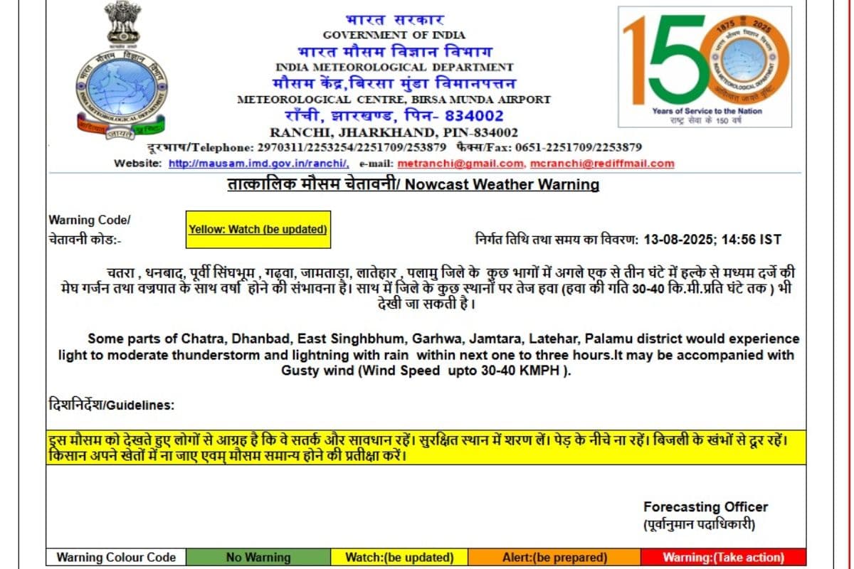 मौसम केंद्र के प्रमुख अभिषेक आनंद ने कहा है कि ये 6 जिले चतरा, धनबाद, पूर्वी सिंहभूम, गढ़वा, जामताड़ा और पलामू हैं. इन जिलों के लिए येलो अलर्ट जारी किया गया है. इसके मुताबिक, इन जिलों में कहीं-कहीं हल्के से मध्यम दर्जे की वर्षा होगी.
