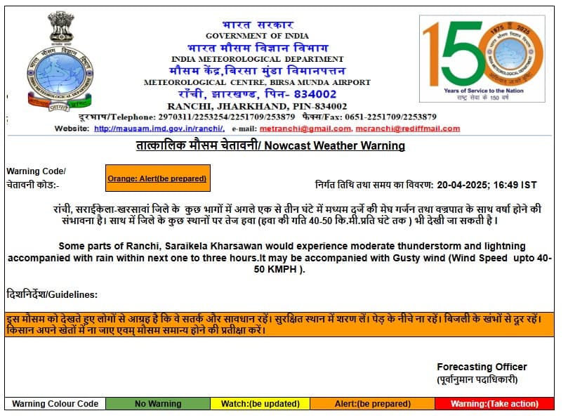 रांची और सरायकेला-खरसावां के लिए मौसम विभाग ने जारी किया ऑरेंज अलर्ट.
