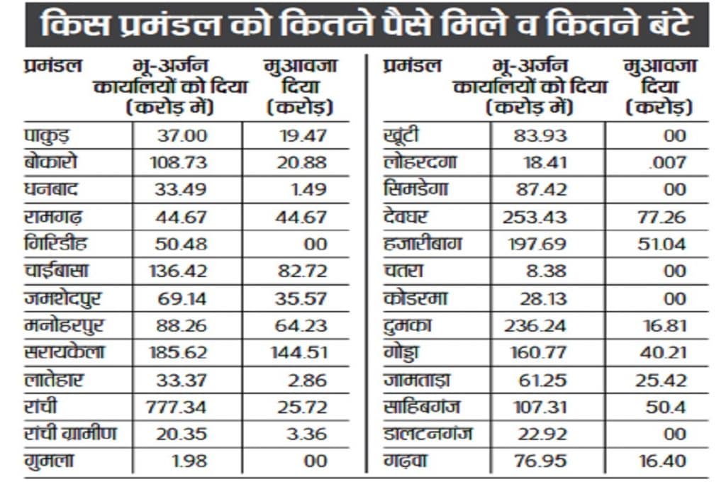 झारखंड में करीब 2920 करोड़ रुपये भू-अर्जन कार्यालयों को दी गयी थी. इसमें से अब तक मात्र करीब 720 करोड़ रुपये का ही वितरण रैयतों के बीच किया गया है.