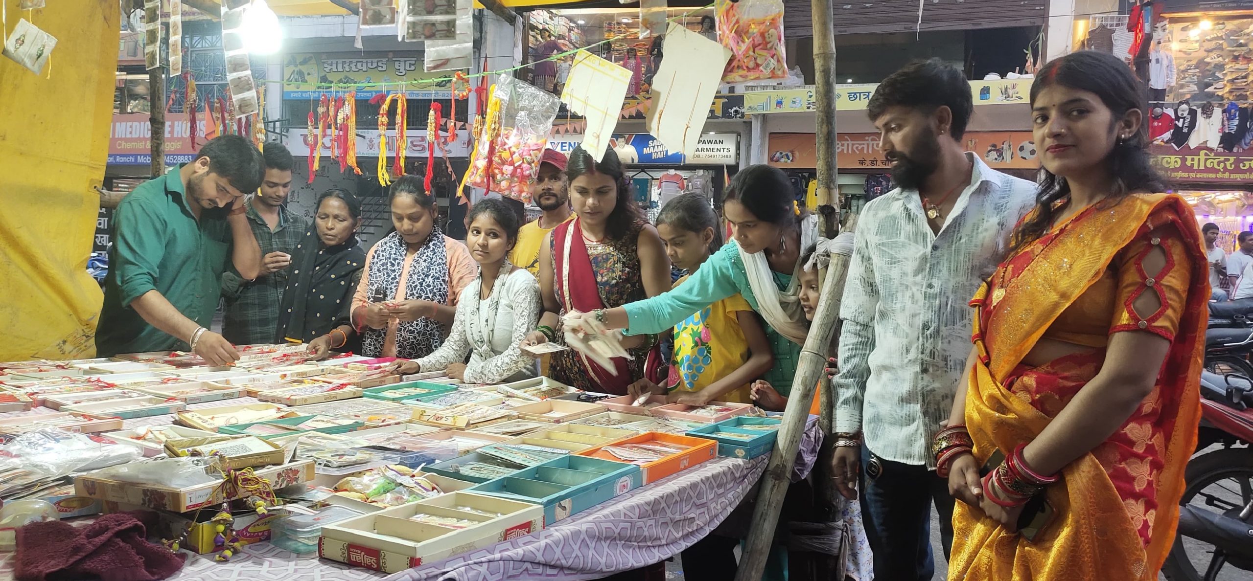 सावन महीने की पूर्णिमा तिथि को मनायी जानेवाली भाई-बहन का पवित्र पर्व रक्षाबंधन की तैयारियां खलारी कोयलांचल में पूरी कर ली गयी है. ऐसे में शनिवार को आयुष्मान और सौभाग्य योग का अद्भुत संयोग है. श्रावण शुक्ल पक्ष की पूर्णिमा पर भाई-बहन का आत्मीय स्नेह का पर्व रक्षाबंधन मनाया जायेगा. इस पर्व को लेकर कोयलांचल के सभी मार्गों केडी बाजार, डकरा, राय आदि स्टॉल सजाये गये हैं. स्टॉल तीन दिनों से सज रहे थे. शुक्रवार को हर स्टॉल पर खरीदारों की भारी भीड़ उमड़ पड़ी. रखी दुकानदार ने बताया कि उनकी दुकानों में राखी की हर वेराइटी उपलब्ध है. पांच रुपये से लेकर 200 रुपये तक की राखी बिक रही हैं. लोग अपनी क्षमता के अनुसार राखी पसंद कर खरीदे. स्टोन राखी की मांग अधिक रही. कार्टून कैटेगरी में प्रकाश निकलता है. इस कारण उसे लोग पसंद कर रहे हैं.08 खलारी 05, खलारी के केडी बाजार में राखी की खरीदारी करती महिलाएं.