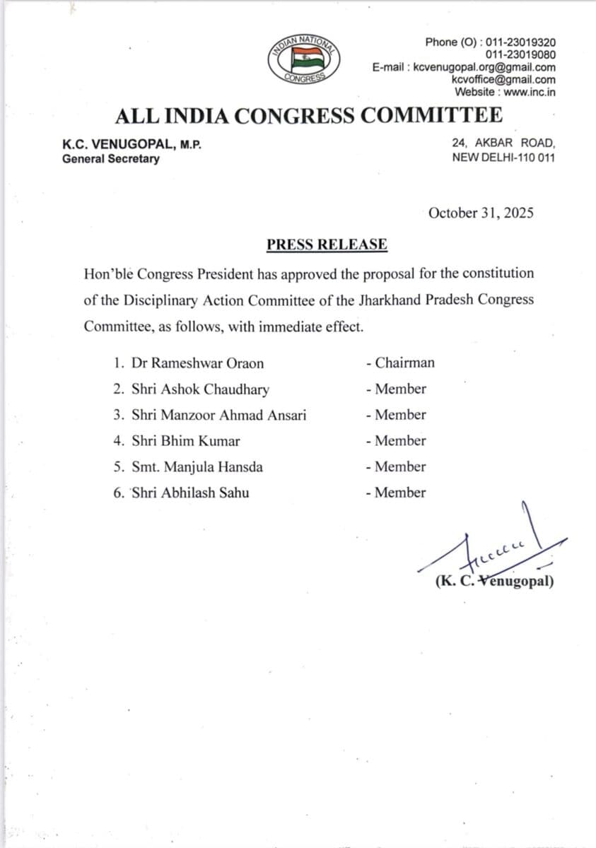 Rameshwar Oraon: रांची-राष्ट्रीय कांग्रेस ने झारखंड के पूर्व मंत्री डॉ रामेश्वर उरांव को झारखंड प्रदेश कांग्रेस कमेटी में संविधान के लिए अनुशासनात्मक कार्रवाई समिति का अध्यक्ष बनाने के प्रस्ताव को स्वीकृति दे दी है. इनके अलावा कमेटी में पांच अन्य सदस्य भी हैं. अशोक चौधरी, मंजूर अहमद अंसारी, भीम कुमार, मंजूला हांसदा और अभिलाष साहू सदस्य बनाए गए हैं. इसमें अध्यक्ष समेत कुछ छह को शामिल किया गया है. कांग्रेस महासचिव केसी वेणुगोपाल की ओर से ये जानकारी दी गयी है.