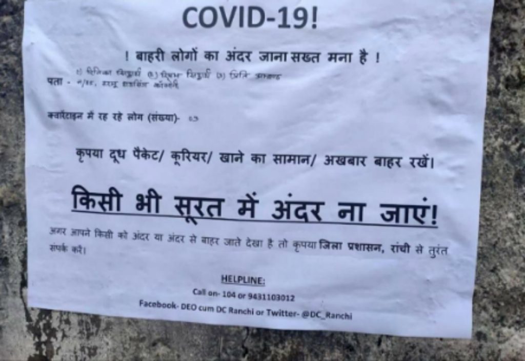 इससे पहले हरमू में एक परिवार को हाउस क्वारेंटाइन किया गया था. प्रशासन को सूचना मिली थी कि परिवार के तीन सदस्य ऑस्ट्रेिलिया से आये थे. इसके बाद किशोरगंज में भी एक व्यक्ति को क्वारेंटाइन किया गया था. हालांकि इनलोगों का रिपोर्ट नेगेटिव आया है. पुलिस ने इन लोगों के घर के बार हाउस क्वारेंटाइन का पर्चा चस्पा किया है. पर्चे पर लिखा है कि इस बाहरी लोगों का अंदर जाना सख्त मना है. अगर किसी को घर से बाहर जाते या किसी को घर के अंदर जाते कोई भी देखे तो तुरंत प्रशासन को सूचना दे.