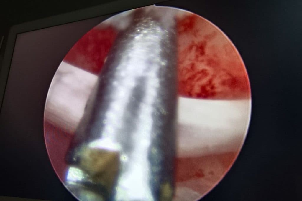 महिला की बच्चेदानी से निकाली गई हड्डियां (बायें) और (दायें) कम्प्यूटर स्क्रीन पर ऑपरेशन के लिए बच्चेदानी में किया गया छिद्र.