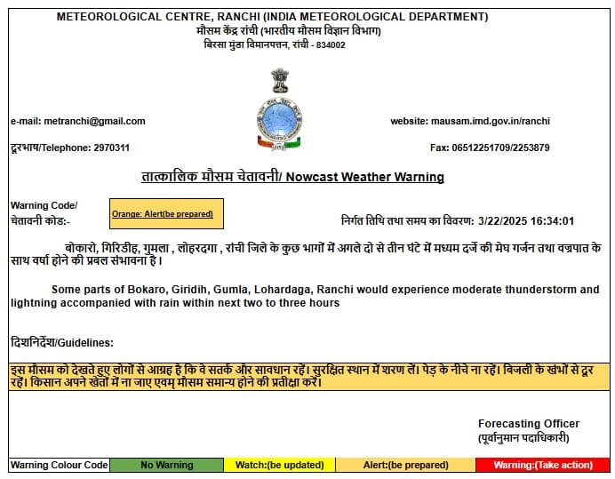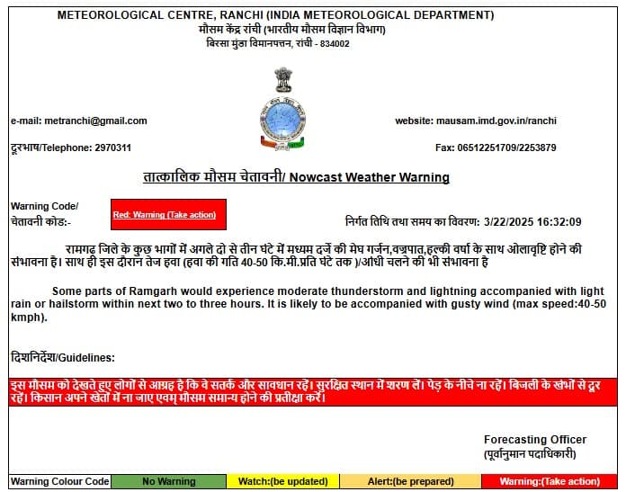 Red Alert In Jharkhand: झारखंड के रामगढ़ जिले के लिए रेड अलर्ट जारी किया गया है. मौसम विभाग ने कुछ ही घंटे में तेज हवाएं चलने, गरज के साथ बारिश और ओलावृष्टि एवं वज्रपात की आशंका जतायी है.