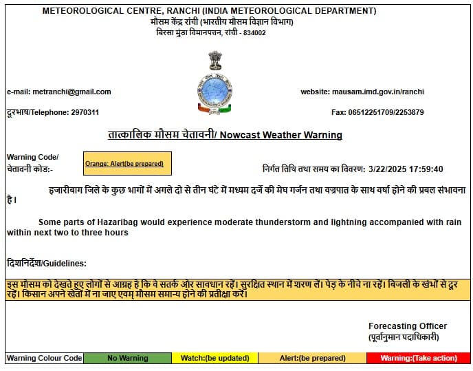 मौसम विभाग ने तात्कालीक मौसम चेतावनी जारी की है. इसके अनुसार अगले दो से तीन घंटे में हजारीबाग जिले के कुछ भागों में मेघ गर्जन के साथ बारिश हो सकती है. वज्रपात की भी आशंका जतायी गयी है. येलो अलर्ट जारी किया गया है.