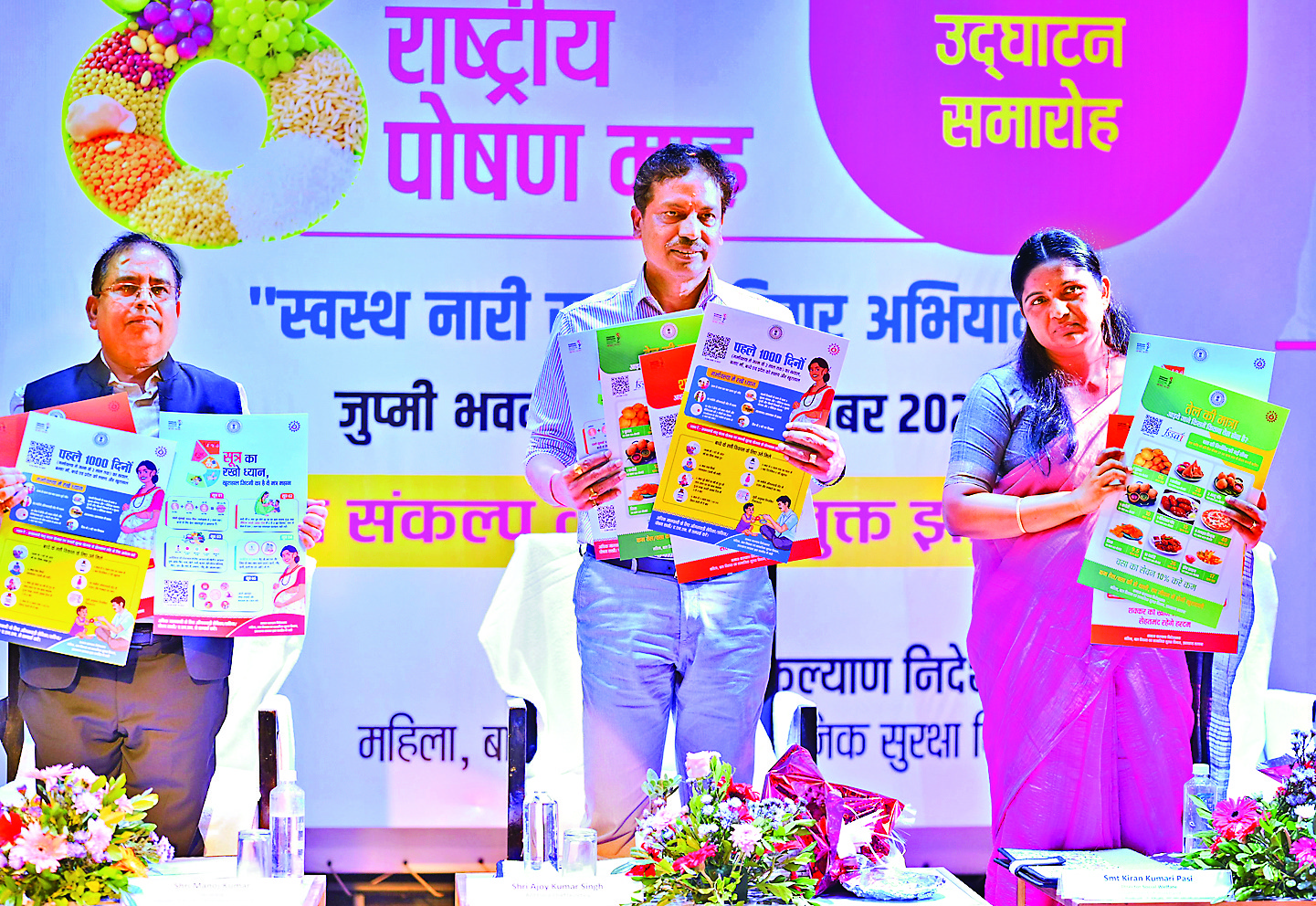 बेहतर स्वास्थ्य के लिए लोग भोजन में तेल, नमक व चीनी का कम से कम उपयोग करें. इससे लोगों को स्वस्थ रहने में मदद मिलेगी. उक्त बातें स्वास्थ्य विभाग के अपर मुख्य सचिव अजय कुमार सिंह ने कही. उन्होंने गुरुवार को आठवां राष्ट्रीय पोषण माह का शुभारंभ किया. कार्यक्रम का आयोजन स्मार्ट सिटी स्थित जुपमी भवन में किया गया. श्री सिंह ने वोकल फॉर लोकल के तहत राज्य में उपलब्ध विभिन्न पोषणयुक्त खाद्य सामग्री से तैयार व्यंजनों की जानकारी सोशल मीडिया पर अपलोड करने को कहा. आंगनबाड़ी सहायिका-सेविका द्वारा लगभग 100 प्रकार के व्यंजन तैयार किये गये थे.स्वस्थ नारी, सशक्त परिवार है थीम
