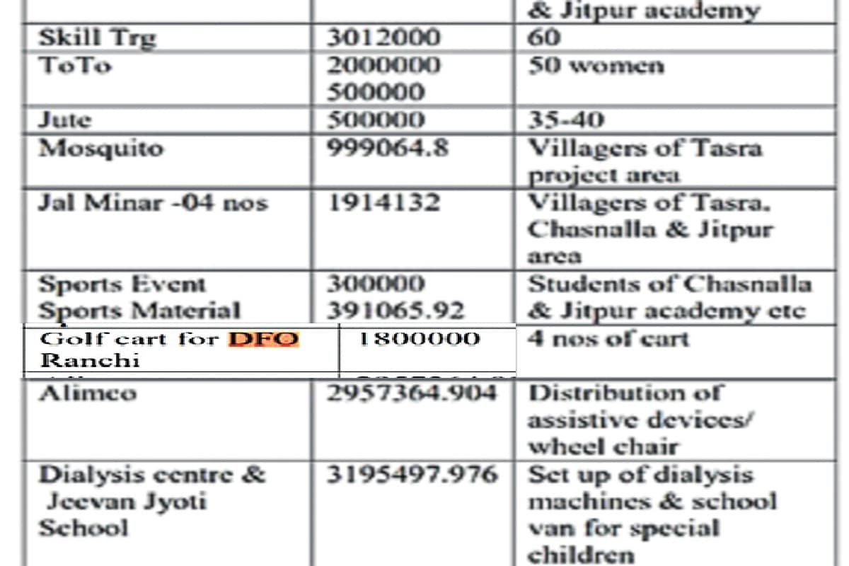 बताया गया कि वित्तीय वर्ष 2023-24 के दौरान तसारा प्रोजेक्ट प्रभावित क्षेत्र में सीएसआर पर 4.22 करोड़ खर्च हुए हैं. इस राशि में रांची डीएफओ के लिए गोल्फ कार्ट की खरीद पर किया गया खर्च भी शामिल है. गोल्फ कार्ट खरीदने के लिए 18 लाख रुपये खर्च किये गये हैं.