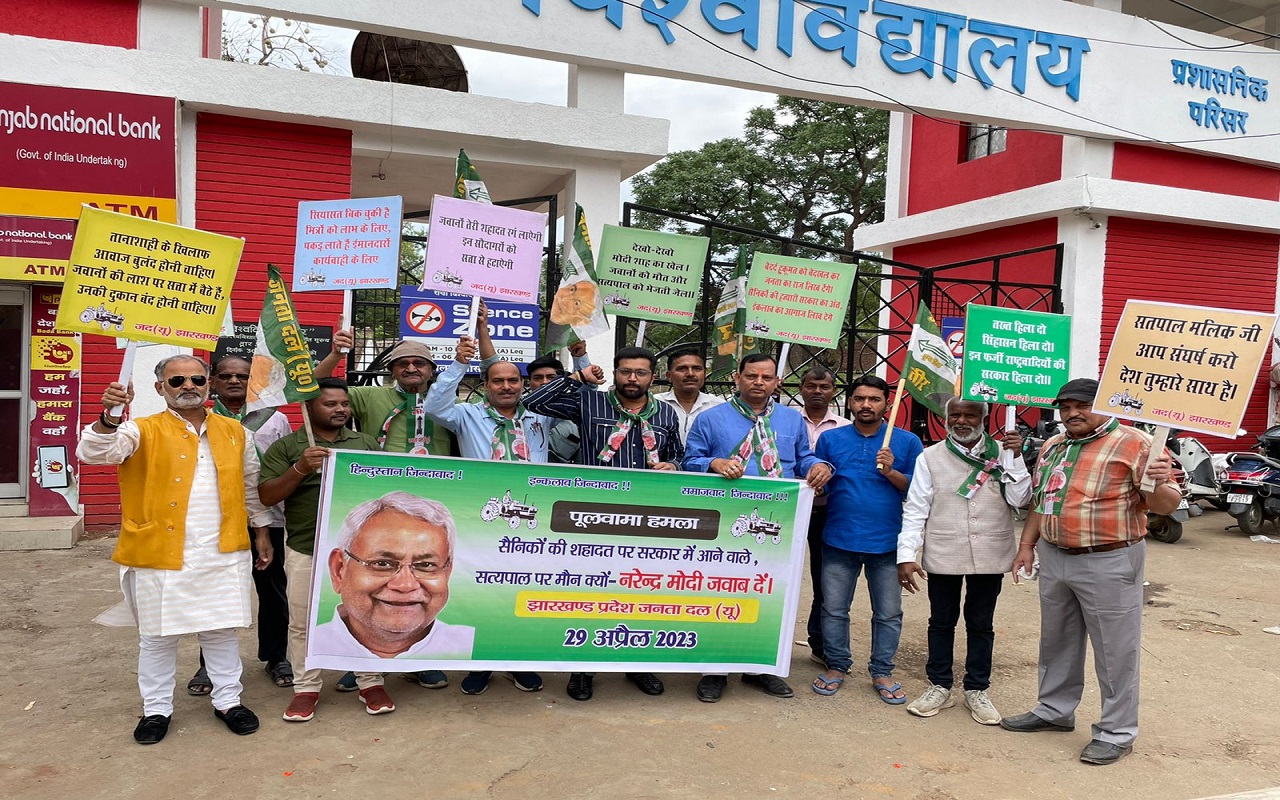 रांची: झारखंड जदयू ने पुलवामा घटना के संदर्भ में जम्मू-कश्मीर के तत्कालीन राज्यपाल सत्यपाल मल्लिक द्वारा दिये गये बयान के समर्थन में आज शनिवार को रांची विश्वविद्यालय से अल्बर्ट एक्का चौक तक मार्च निकाला. इस दौरान नेताओं ने केंद्र सरकार के खिलाफ नारेबाजी की और प्रदर्शन किया. इसका नेतृत्व झारखंड जदयू के महासचिव श्रवण कुमार ने किया.