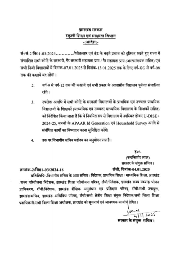 झारखंड में केजी से आठवीं तक की कक्षाएं 13 जनवरी तक रहेंगी बंद, शिक्षा विभाग ने जारी किया आदेश