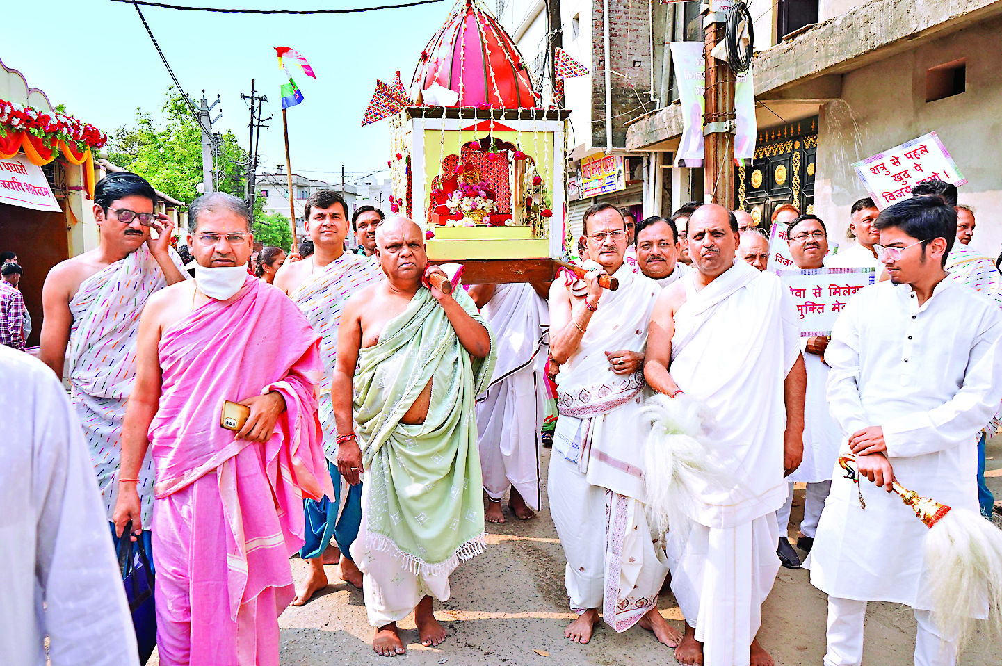 रांची. जैन धर्म के 24वें तीर्थंकर भगवान महावीर की जयंती पर गुरुवार को श्वेतांबर जैन मंदिर डोरंडा में भगवान महावीर का जन्म कल्याणक महोत्सव मनाया गया. इस अवसर पर भगवान की स्नान पूजा हुई. फिर भगवान की शोभायात्रा निकाली गयी. शोभायात्रा मंदिर परिसर से नामकुम रोड, तुलसी चौक, झंडा चौक, श्रीराम भरत मिलाप कार्यालय, पुराना हाइकोर्ट होते हुए वापस मंदिर परिसर पहुंची. रास्ते में विभिन्न संगठनों ने शोभायात्रा का स्वागत किया. मंदिर पहुंचने के बाद भगवान महावीर को मंदिर में रखा गया.