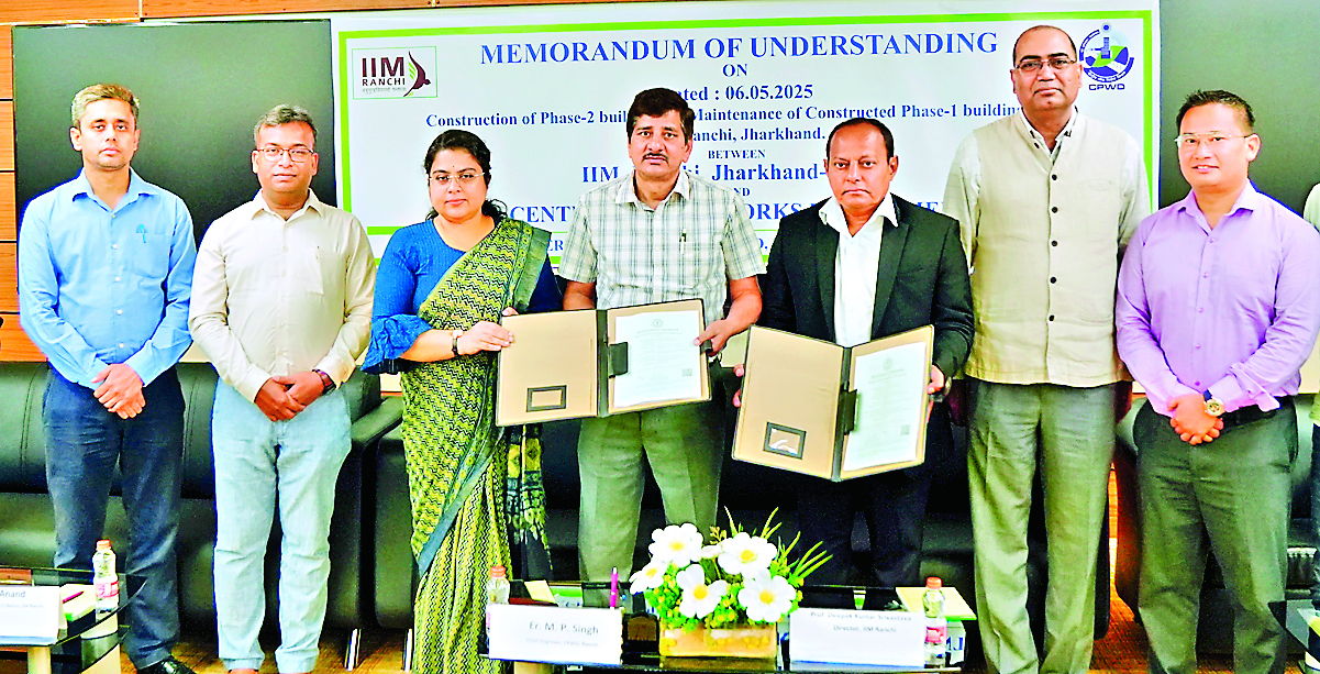 रांची. आइआइएम रांची और सेंट्रल पब्लिक वर्क डिपार्टमेंट (सीपीडब्ल्यूडी) के बीच मंगलवार को एमओयू हुआ. एमओयू के तहत सीपीडब्ल्यूडी आइआइएम रांची के मौजूदा परिसर के रखरखाव के साथ द्वितीय चरण के निर्माण कार्य को पूरा करेगा. द्वितीय चरण के निर्माण कार्य के दौरान कैंपस में स्पोर्ट्स कॉम्पलेक्स का निर्माण होगा. वहीं, मैनेजमेंट डेवलपमेंट सेंटर (एमडीसी) का भी निर्माण होना है.