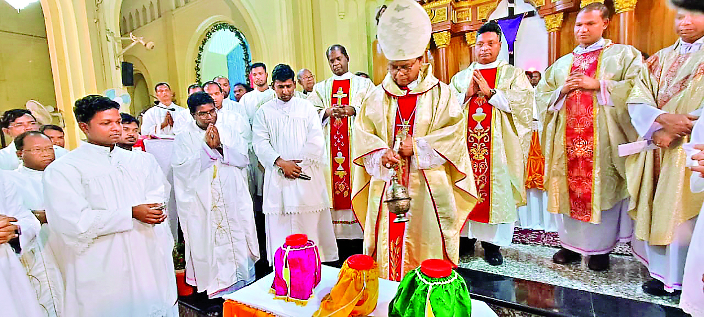 रांची़ संत मरिया महागिरजाघर में सोमवार को क्रिज्म मिस्सा का आयोजन हुआ. इस मिस्सा बलिदान की अगुवाई रांची कैथोलिक महाधर्मप्रांत के आर्चबिशप विंसेंट आईंद ने किया. पवित्र तेल की आशीष की गयी. इस विशेष धर्मविधि में तीन तरह के तेल की आशीष हुई. पहला पवित्र विलेपन का तेल, दूसरा बीमारों का तेल और तीसरा दीक्षार्थियों का तेल. आर्चबिशप ने कहा कि पीड़ितों और जरूरतमंदों की सेवा में अपने जीवन को समर्पित करना ही पुरोहिताई है. दूसरों के जीवन में सकारात्मक परिवर्तन लाना ही कलीसिया का उद्देश्य है. आर्चबिशप ने कहा कि इन तेलों की आशीष की जाती है, ताकि हम इसके द्वारा चंगाई के मिशन कार्य को आगे बढ़ायें. आर्चबिशप ने कहा कि पुरोहित अपनी जिम्मेदारी का निर्वहन कर सकें, इसके लिए सभी को साथ देने की जरूरत है. समारोह में रांची यीशु धर्मसंघ के प्रोविंशियल फादर अजीत कुमार खेस, संत मारिया महागिरजाघर के पल्ली पुरोहित फादर आनंद डेविड खलखो, फादर वीरेंद्र खलखो, फादर प्रफुल तिग्गा, फादर बिपिन कंडुलना, फादर रॉबर्ट मिंज आदि शामिल हुए.