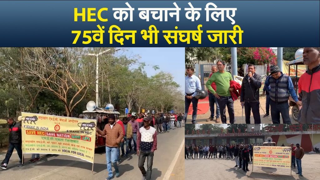 एचईसी के अधिकारियों का विरोध प्रर्दशन लगातार 75वें दिन भी जारी है. एचईसी के अधिकारियों को पिछले 15महीनों से वेतन नहीं मिला है. ऐसे में अपनी वेतन की मांग करते हुए एचईसी के अधिकारी लगातार आंदोलन कर रहें है. इसी क्रम में सोमवार अधिकारियों ने एचईसी मुख्यालय से होते हुए प्रोजेक्ट भवन तक पैदल मार्च निकाला. इस दौरान एचईसी के अधिकारियों ने अपने हक की मांग राज्य और केंद्र सरकार से की.