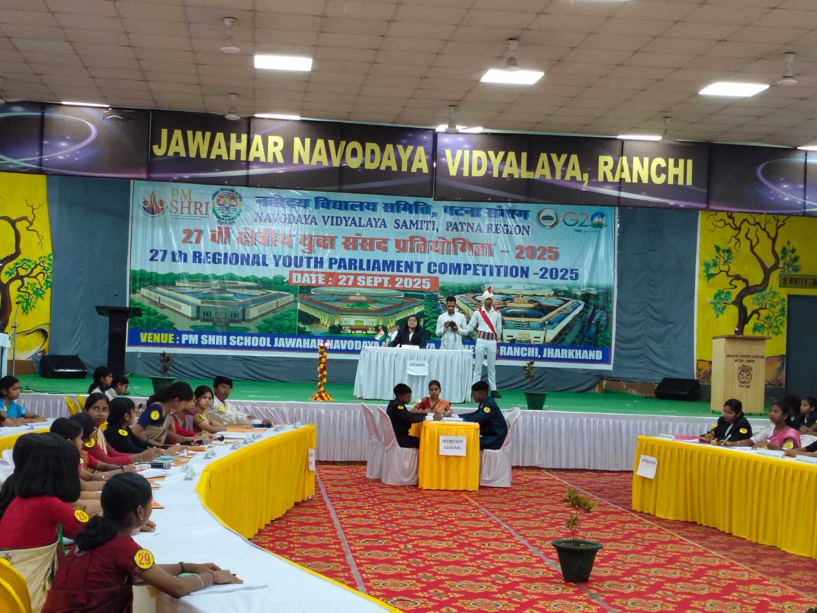 पीएमश्री स्कूल जवाहर नवोदय विद्यालय मेसरा में जवाहर नवोदय विद्यालय पटना संभाग के द्वारा 27वां क्षेत्रीय युवा संसद प्रतियोगिता 2025 आयोजित की गयी. प्रतियोगिता में बिहार के मुंगेर से 14 छात्र व 25 छात्राएं, पश्चिम बंगाल के पुरुलिया से 18 छात्र व 37 छात्राएं, हजारीबाग से 22 छात्र व 28 छात्राएं शामिल हुए. प्रतियोगिता में विद्यार्थियों ने संसद की कार्यवाही का प्रदर्शन किया. जिसमें जवाहर नवोदय विद्यालय पुरुलिया को प्रथम व मुंगेर द्वितीय व हजारीबाग को तृतीय स्थान मिला. प्रतियोगिता का उदघाटन मुख्य अतिथि कांके विधायक सुरेश कुमार बैठा, विशिष्ट अतिथि सहायक आयुक्त आरके चौधरी, मनन विद्या के प्राचार्य रेखा नायडू ने संयुक्त रूप से दीप जला कर किया. कार्यक्रम का उद्देश्य विद्यार्थियों में लोकतांत्रिक व संसदीय प्रक्रिया की समझ तथा उनके भीतर छुपे नेतृत्व कौशल को विकसित करना था. मुख्य अतिथि ने कहा कि ऐसे आयोजन से विद्यार्थियों में लोकतंत्र व संसदीय प्रक्रिया तथा नेतृत्व कौशल का सक्रिय विकास होता है. सभी विद्यार्थी देश के भविष्य हैं. विशिष्ट अतिथि ने संपूर्ण कार्यक्रम के दौरान संसदीय गरिमा को बनाये रखने का सुझाव दिया. प्राचार्य एनोस केरकेट्टा ने सभी अतिथियों का स्वागत किया. मौके पर एनसीसी पदाधिकारी अजीत मंडल, शिक्षक व विद्यार्थी मौजूद थे.मेसरा में क्षेत्रीय युवा सांसद प्रतियोगिता 2025 का आयोजनB