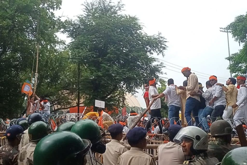 मोरहाबादी मैदान में शुक्रवार को युवा आक्रोश रैली खत्म होने के बाद भाजयुमो के नेतृत्व में भाजपा नेता और कार्यकर्ता मुख्यमंत्री आवास की ओर बढ़ने लगे. जैसे ही भाजपा समर्थकों ने सीएम आवास की ओर बढ़ने की कोशिश की, पुलिस ने उन्हें रुकने के लिए कहा. भाजपा समर्थक नहीं रुके. कई समर्थक कंटीले बैरिकेडिंग पर खड़े हो गए. प्रदर्शन करने लगे.