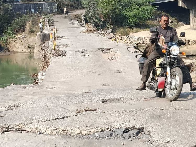 पिपरवार. पिपरवार कोयलांचल से मॉनसून को विदा हुए लगभग एक महीना हो चला है. परंतु, अशोक परियोजना वर्कशॉप के निकट बारिश में क्षतिग्रस्त हुए दामोदर नद के टेढ़ी पुल को अब तक दुरुस्त नहीं किया गया है. जिससे आवागमन में लोगों की परेशानी अब तक बनी हुई है. लोग जान जोखिम में डाल इस क्षतिग्रस्त पुल से आवागमन करने को विवश हैं. जानकारी के अनुसार यह पुल बेंती, जोबिया, न्यूमंगरदाहा, कुसुमटोला, पुरनाडीह, अशोक परियोजना, किचटो, चिरैयाटांड़, बिलारी, कारो, बहेरा, कल्याणपुर आदि कई गांवों को जोड़ता है. ग्रामीण पिपरवार जीएम आफिस, एनके जीएम ऑफिस, अस्पताल, बैंक, पोस्ट ऑफिस जाने के लिए इसी पुल का उपयोग करते हैं. टेढ़ी पुल के समानांतर ट्रांसपोर्टिंग पुल पर बड़े वाहनों का आवागमन व बड़े-बड़े गड्ढे होने की वजह से आम लोग इसका उपयोग नहीं करते हैं. जानकारी के अनुसार सीसीएल अधिकारी भी अशोक परियोजना से आवागमन के लिए टेढ़ी पुल का ही उपयोग करते हैं. ग्रामीणो ने प्रबंधन से अतिशीघ्र पुल मरम्मत की मांग की है.