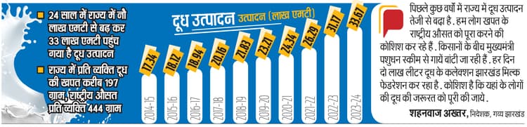 राज्य गठन के बाद झारखंड में दूध उत्पादन तेजी से बढ़ा है. इसके बावजूद यहां के लोगों को जरूरत भर दूध नहीं मिल रहा है. प्रति व्यक्ति दूध की खपत राष्ट्रीय औसत से आधे के करीब ही है. इसके पीछे कई कारण हैं. यहां के जनजातीय लोगों में दूध पीने को लेकर बहुत जागरूकता नहीं है. यहां आज भी दूसरे राज्यों से दूध आ रहा है. राज्य गठन के समय झारखंड में दूध का उत्पादन मात्र नौ लाख मीट्रिक टन के आसपास था. आज यह बढ़कर 33 लाख एमटी के आसपास पहुंच गया है. चालू वित्त वर्ष में इसको 36 लाख एमटी करने का लक्ष्य रखा गया है. झारखंड में प्रति व्यक्ति दूध की खपत 197 ग्राम के आसपास ही है. जबकि दूध खपत का राष्ट्रीय औसत 444 ग्राम है. राज्य सरकार ने 2024-25 में इसको 237 ग्राम तक ले जाने का लक्ष्य रखा है. इसके लिए कृषि, पशुपालन एवं सहकारिता विभाग कई प्रयास कर रहा है.करीब तीन लाख लीटर का डेयरी प्लांट चल रहा :